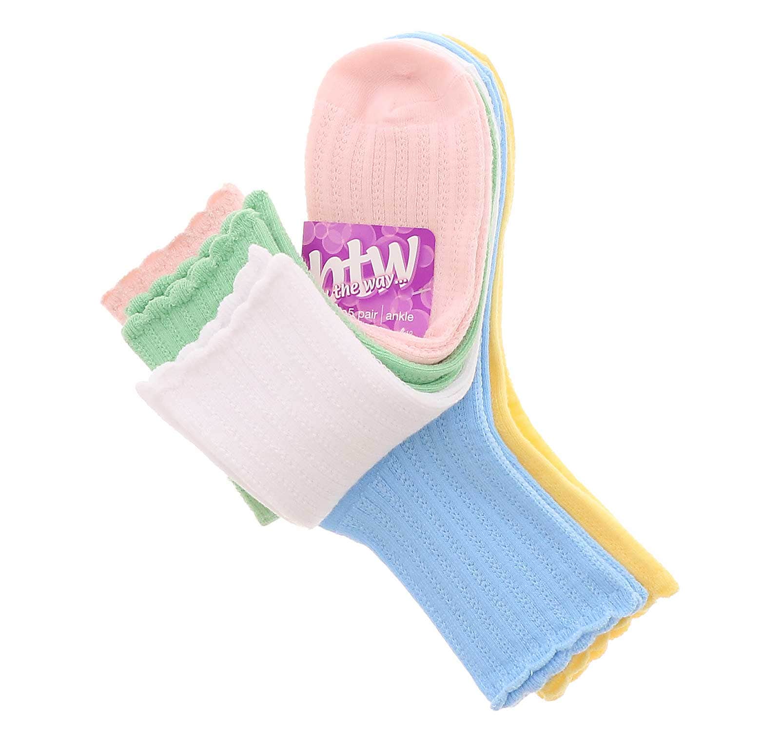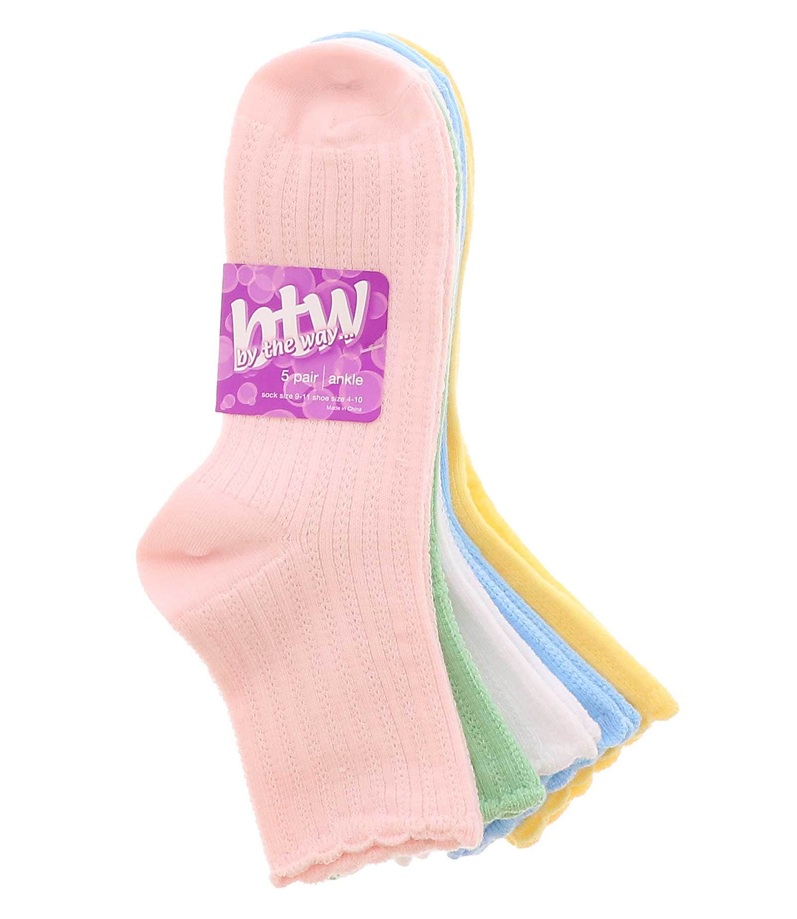 Step into comfort and style with the BTW 5-Pack Pointelle Rib Women’s Ankle Socks. Designed to sit just above the ankle with a scalloped edge, these lightweight socks feature soft cushioning and breathable fabric to keep your feet cool, dry, and comfortable from morning to night. Fits Adult shoe sizes 4-10.