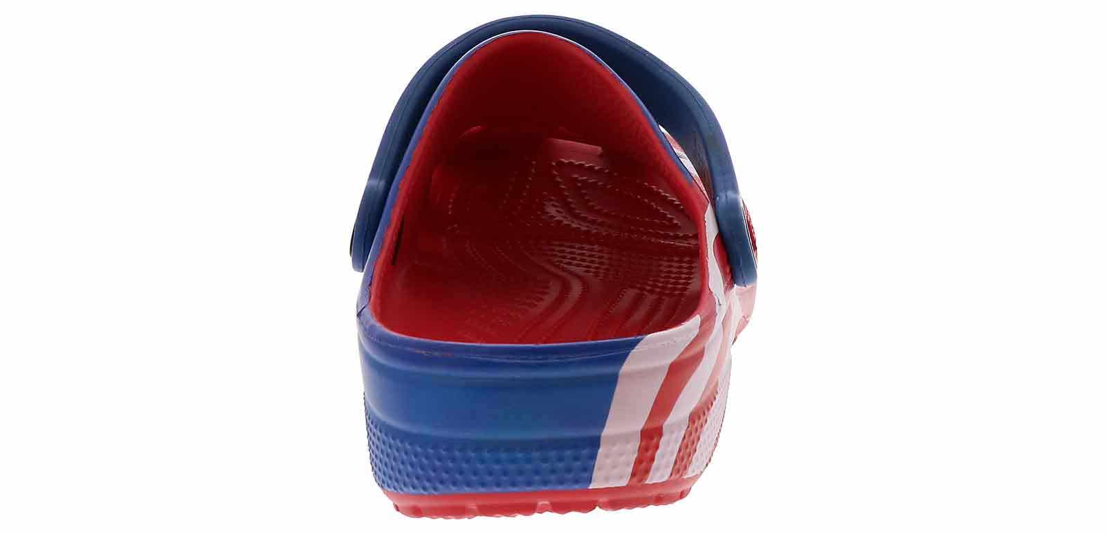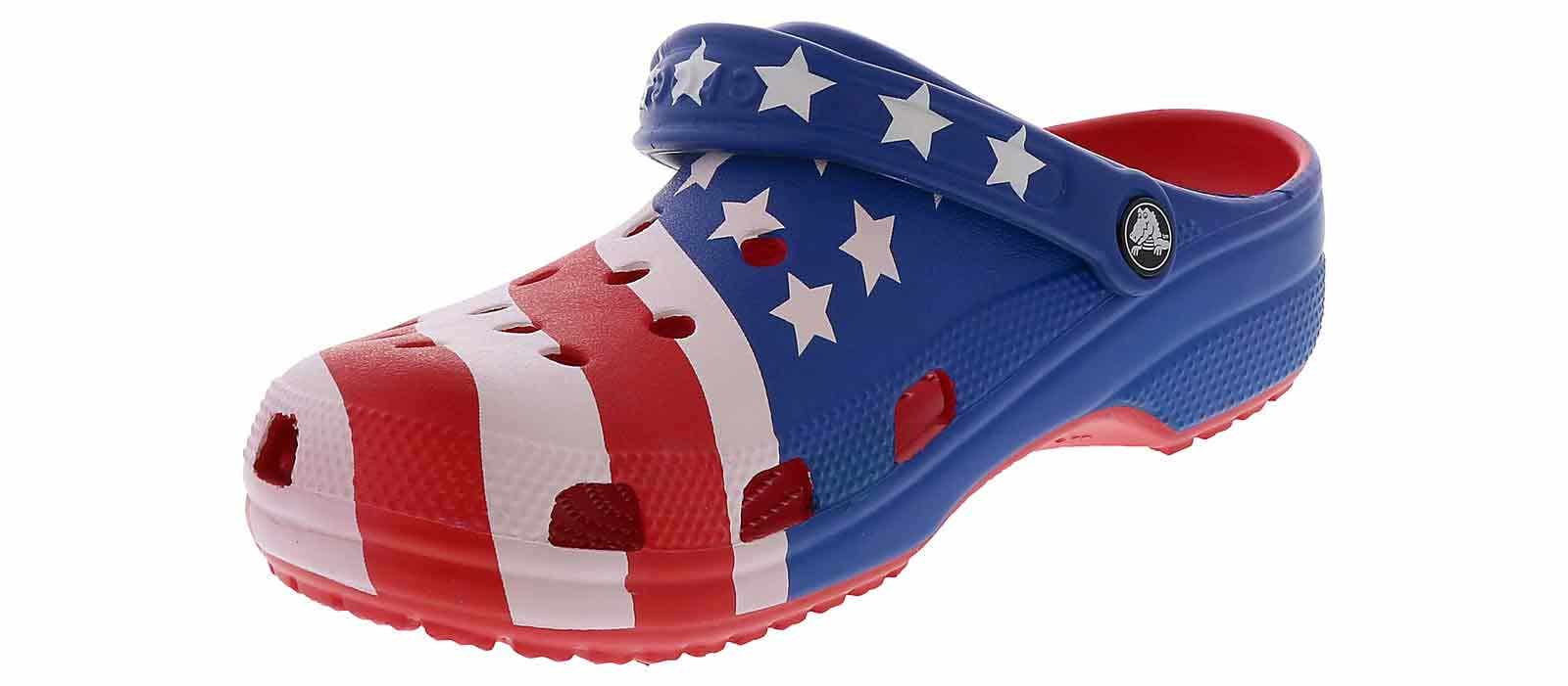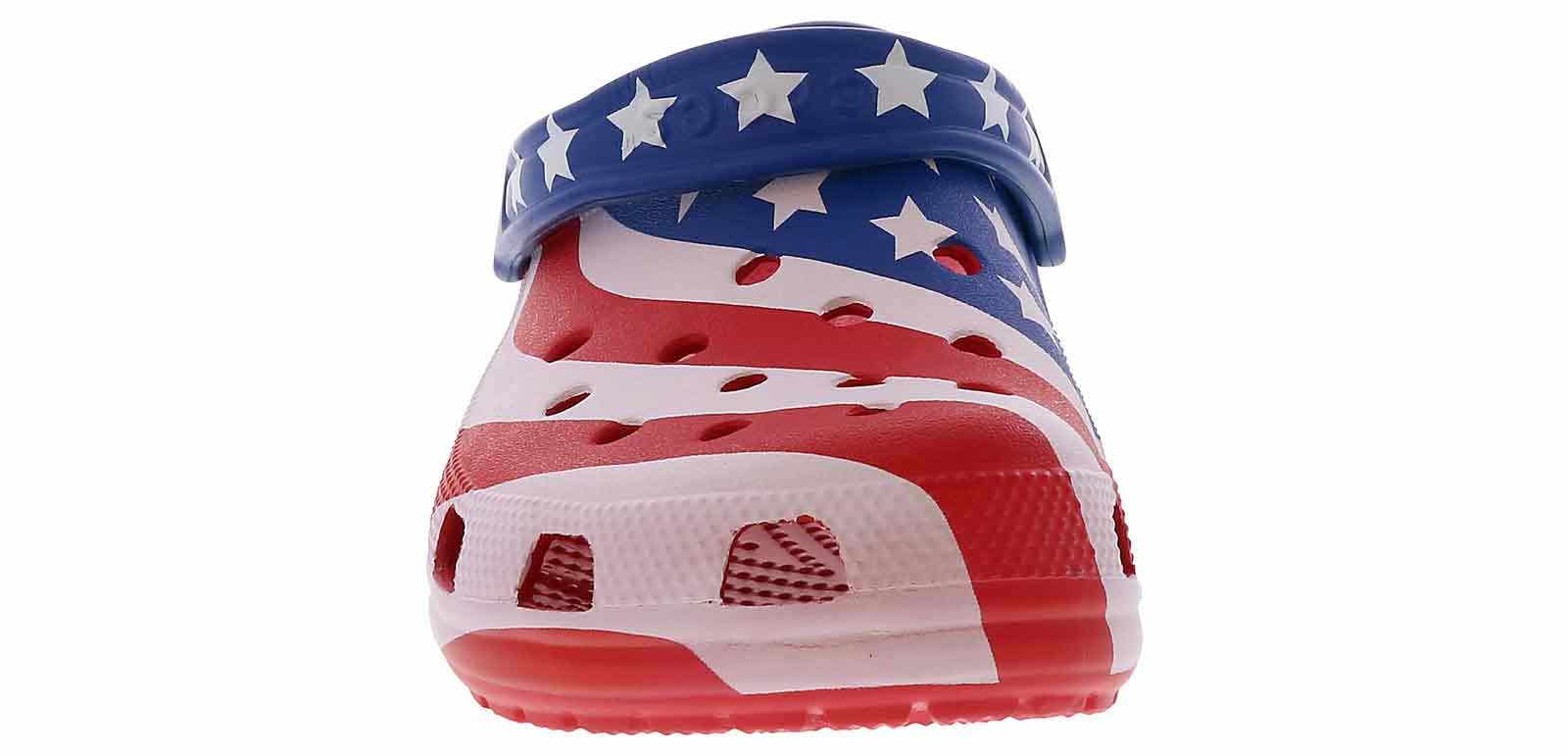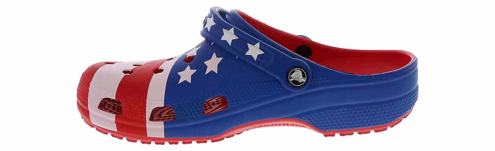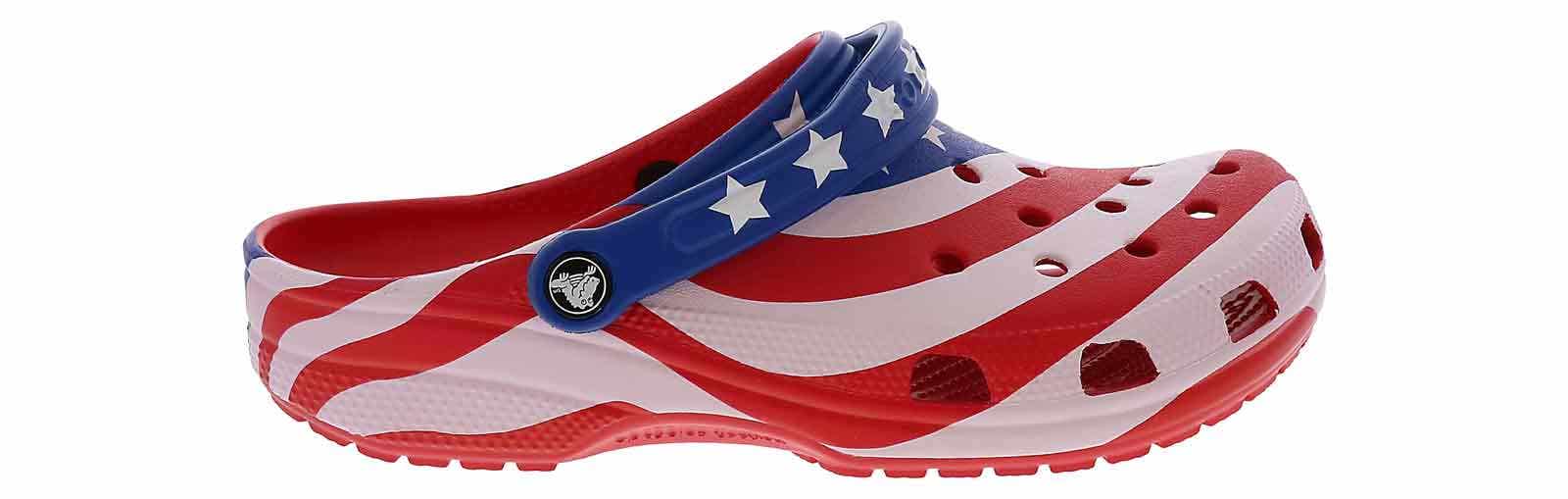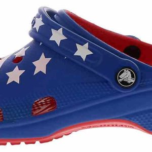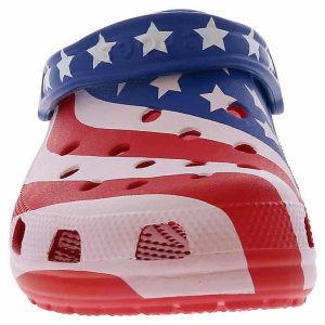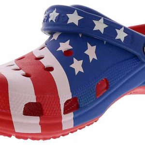 Step into a true american classic with the Crocs Classic American Flag Men’s Clog! This vibrant USA Flag-colored style is the perfect blend of comfort and summer fashion with its cushioned footbed and lightweight materials. The rotating heel strap and ventilation ports allow security and breathability with every step. Embrace the boldness of the Crocs Classic American Flag Men’s Clog!