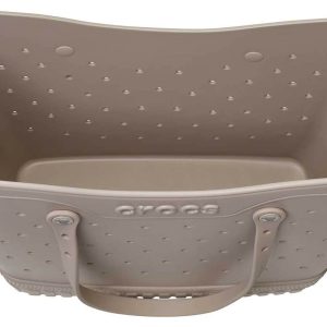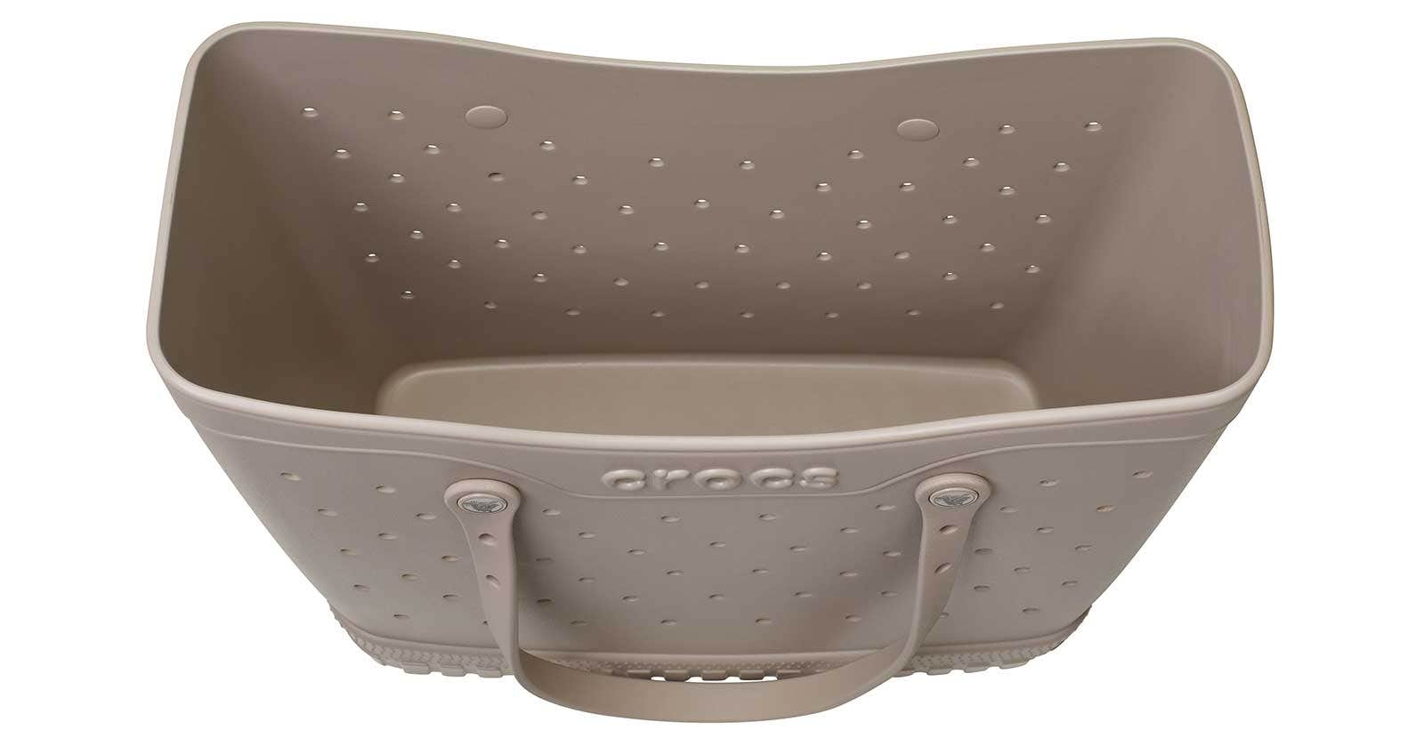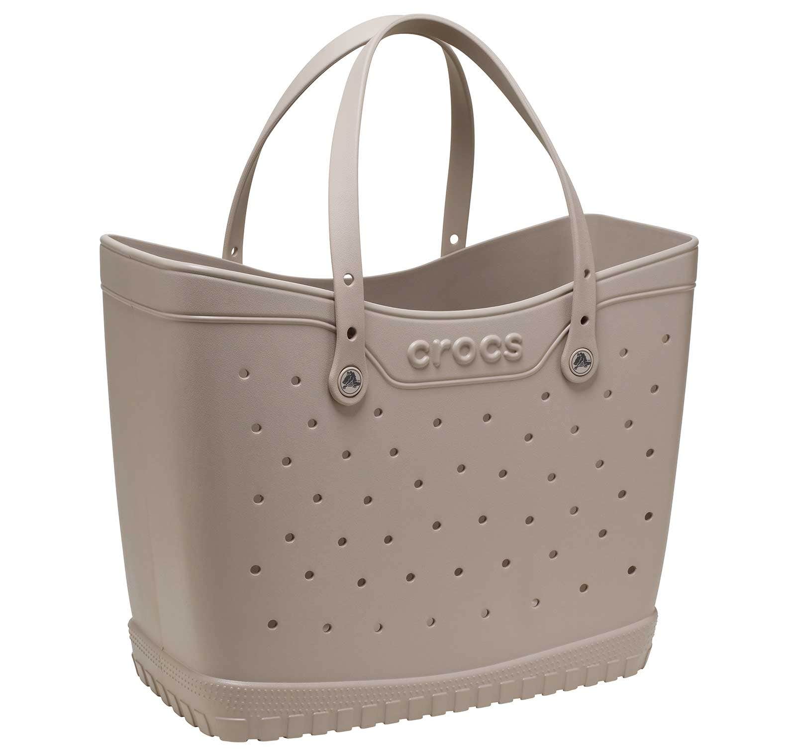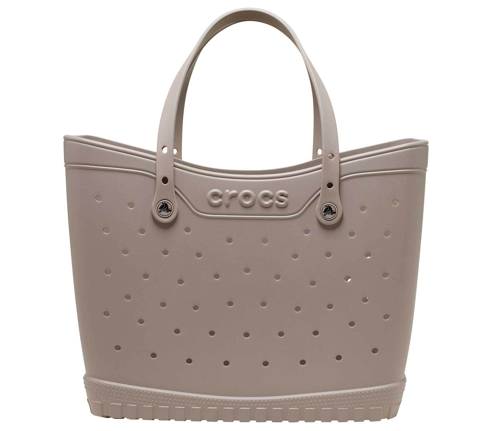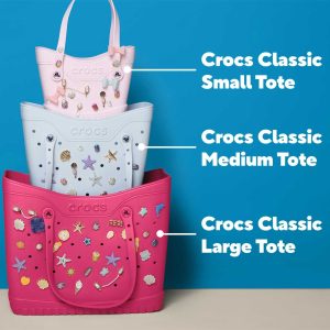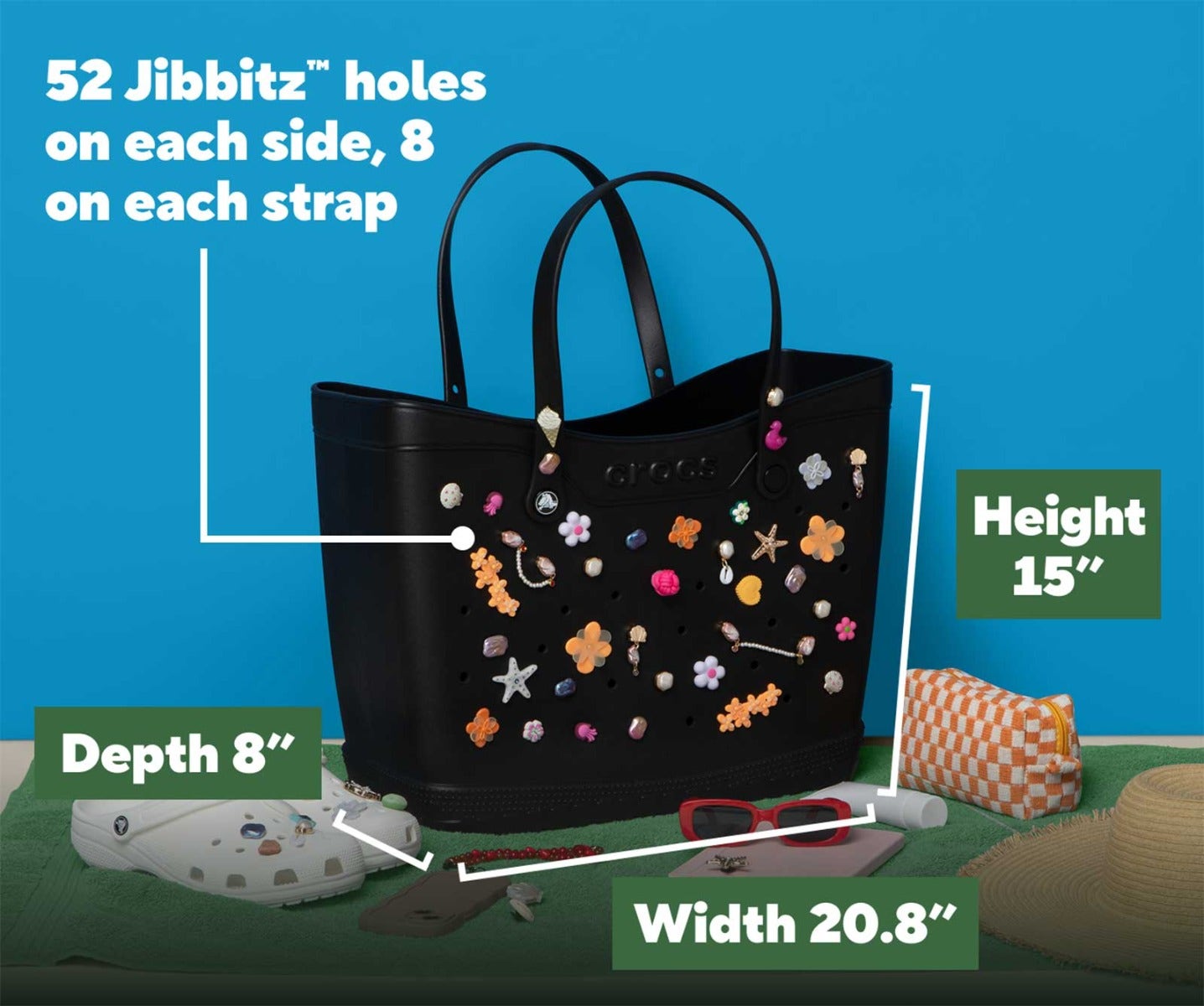 Why get the same old tote bag when you can make this one your own? Introducing the Crocs Classic Large Tote, perfect for carrying everything you need. Personalize with Jibbitz charms! 52 holes on each side, and 8 holes on each side of the straps. The top width tapers out for even easier visibility while base is slightly narrower and the dipped curve on top of the bag allows for easier wearability from the shoulder and easier access to interior.