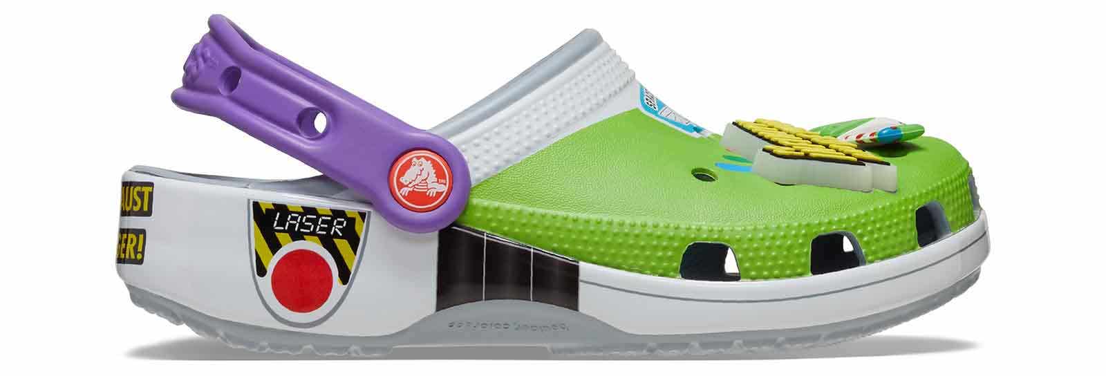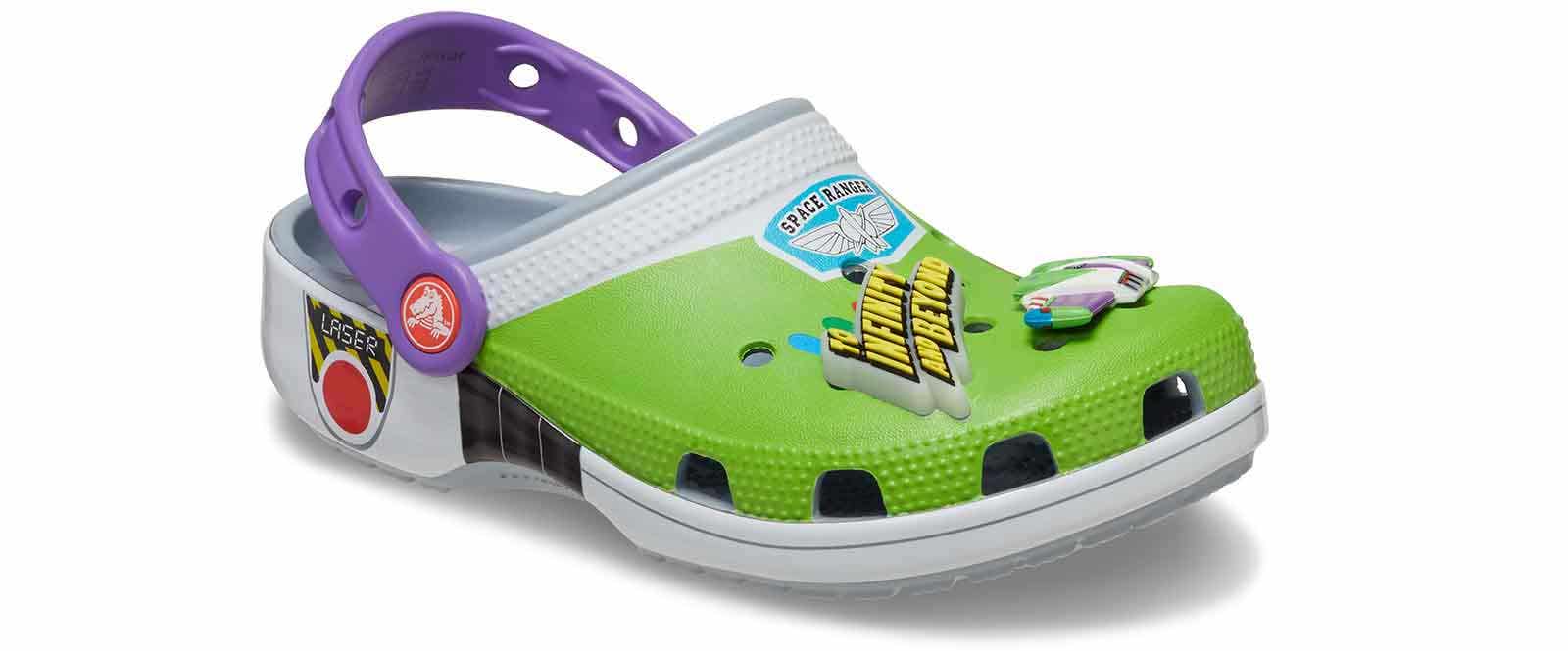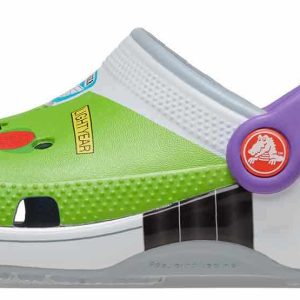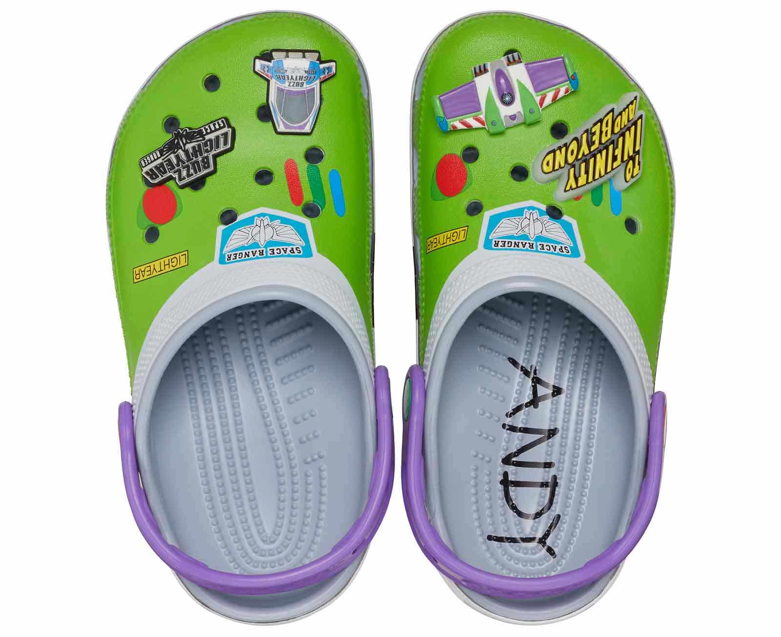Attention Star Command! The exclusive Buzz Classic Clog has crash landed on a strange planet. This limited-edition style features a fully wrapped print design inspired by the iconic Space Ranger costume, including four exclusive Jibbitz charms. These clogs also feature the beloved Andy signature on the inside sole.