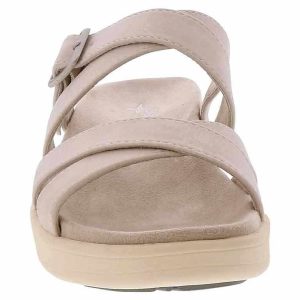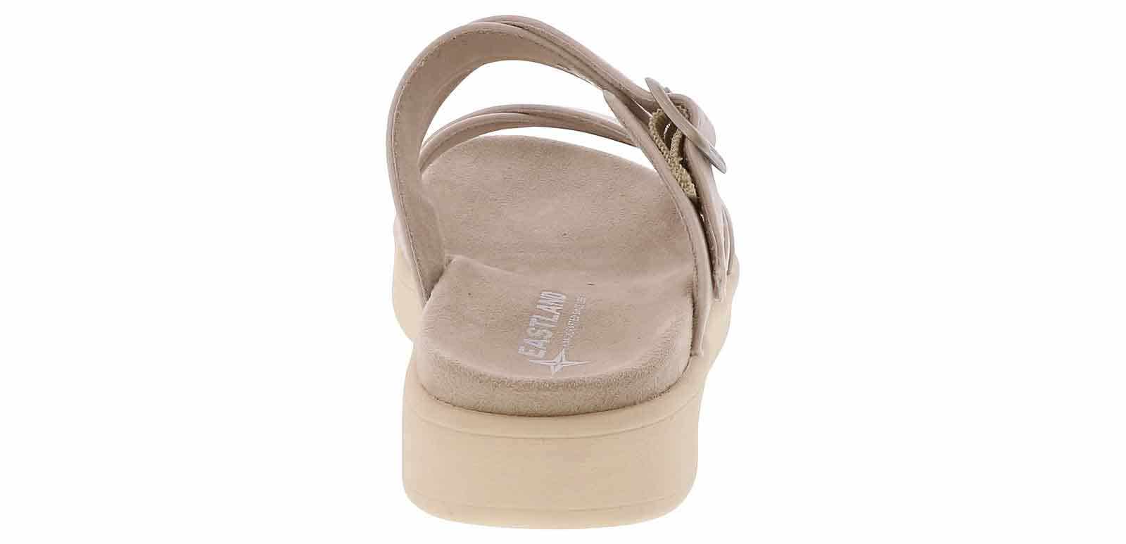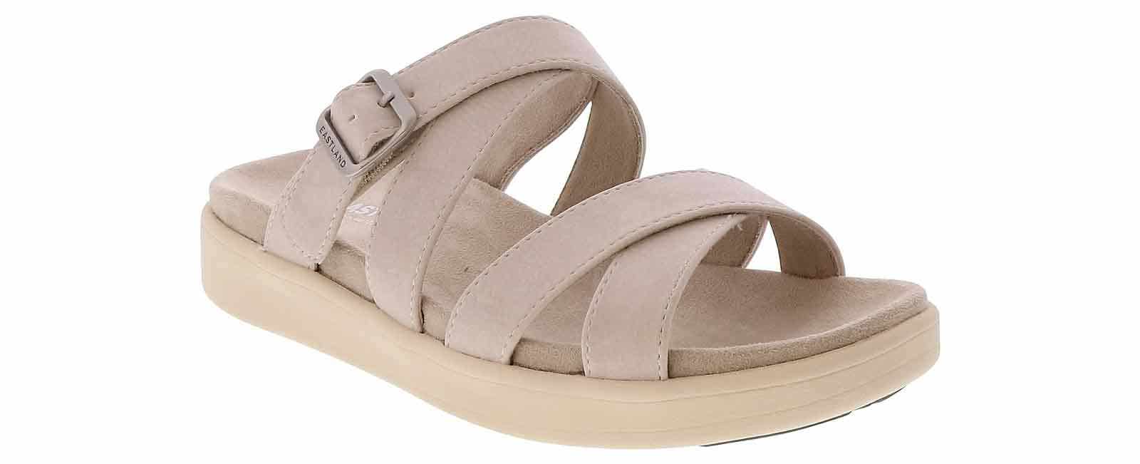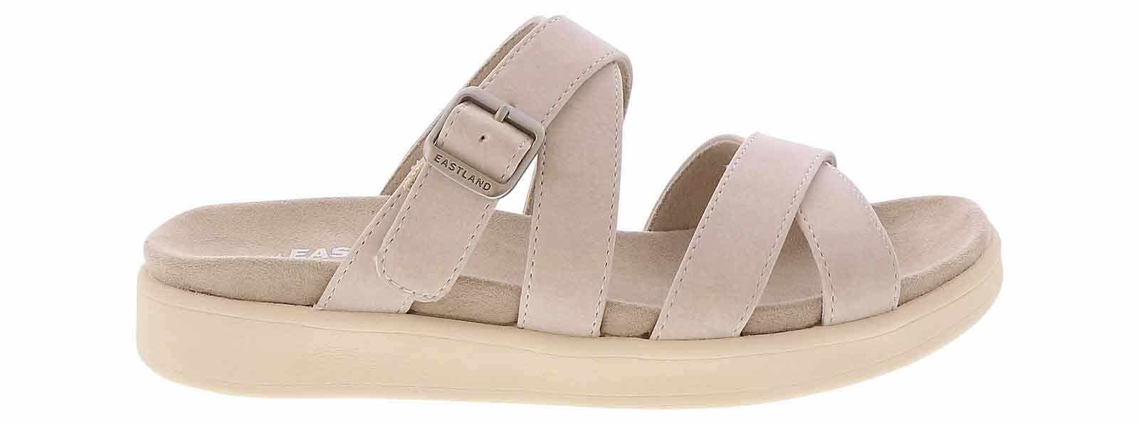 Step into timeless style and boundless comfort wearing the Eastland Marshfield Beige Strap Women’s Sandal. Crafted with exquisite detail, this sandal boasts an adjustable strap and buckle for a bespoke fit. Its leather/suede upper, paired with a micro-suede/cotton blend lining, ensures barefoot bliss. Enjoy all-day support on the contoured cushioned footbed. Finished with a light, flexible rubber outsole for unmatched comfort, slip resistance, and durability.