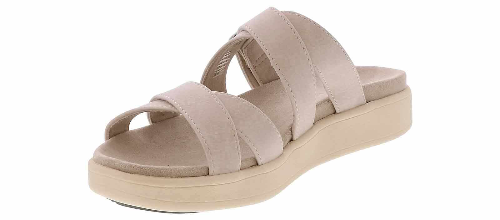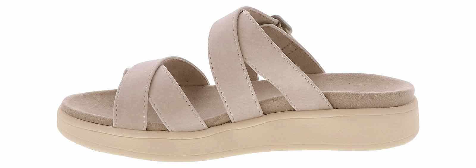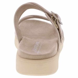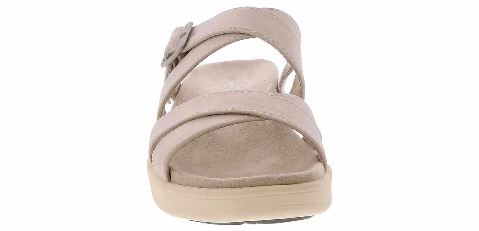 Step into timeless style and boundless comfort wearing the Eastland Marshfield Beige Strap Women’s Sandal. Crafted with exquisite detail, this sandal boasts an adjustable strap and buckle for a bespoke fit. Its leather/suede upper, paired with a micro-suede/cotton blend lining, ensures barefoot bliss. Enjoy all-day support on the contoured cushioned footbed. Finished with a light, flexible rubber outsole for unmatched comfort, slip resistance, and durability.
