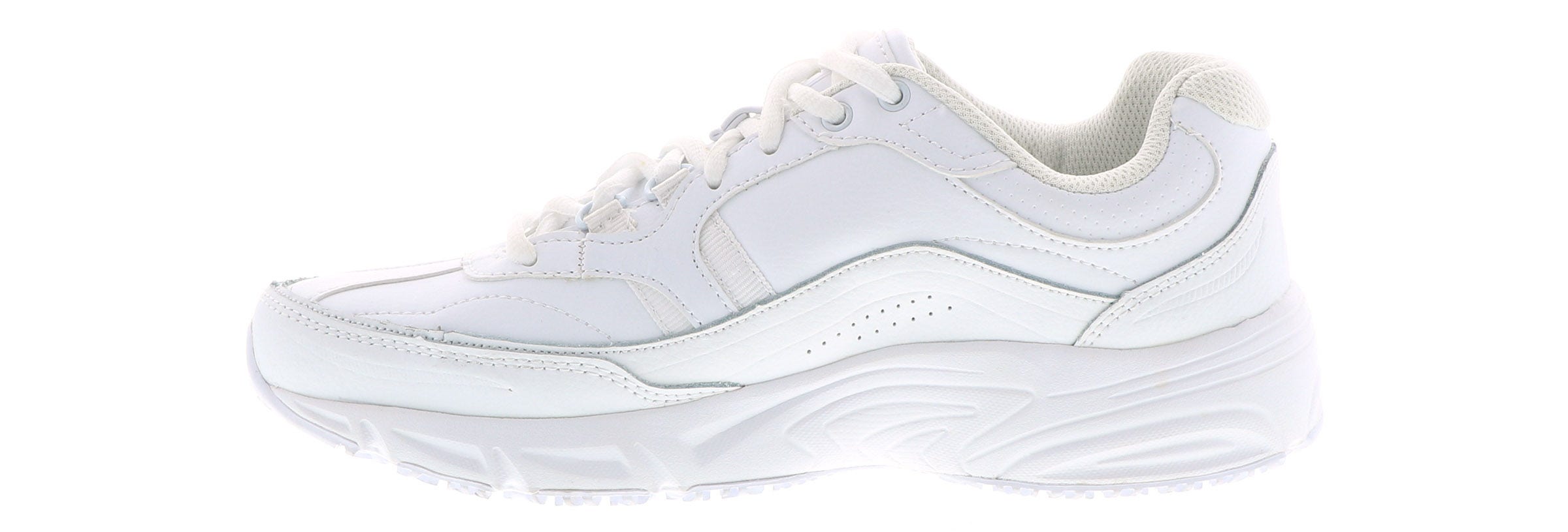 Feel comfortable while working in these Fila Workshift Women’s Wide Width Work Shoe. This style features a leather and mesh fabric upper with a padded collar and tongue for comfort and support. The Fila Workshift work shoes have a memory foam insole to ensure comfort while you are on your feet all day, while the slip resistant rubber outsole will keep you safe on the job.