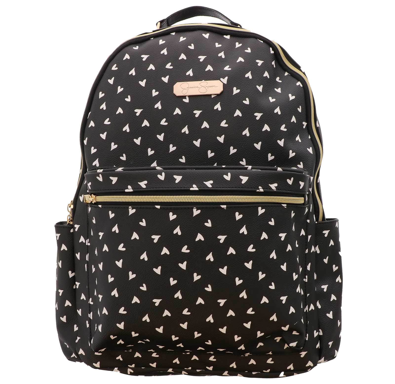 Travel to and from work or school in style with the Jessica Simpson Backpack With 16in Laptop Sleeve. Padded straps help to ease stress on your shoulders, while the integrated laptop sleeve offers protection for your electronics when you’re on the move. Enjoy Effortless Style with the Jessica Simpson All Over Black Heart Backpack. Featuring an all-black with white hearts design, multiple pockets and 2 side pockets for water bottles or umbrellas.