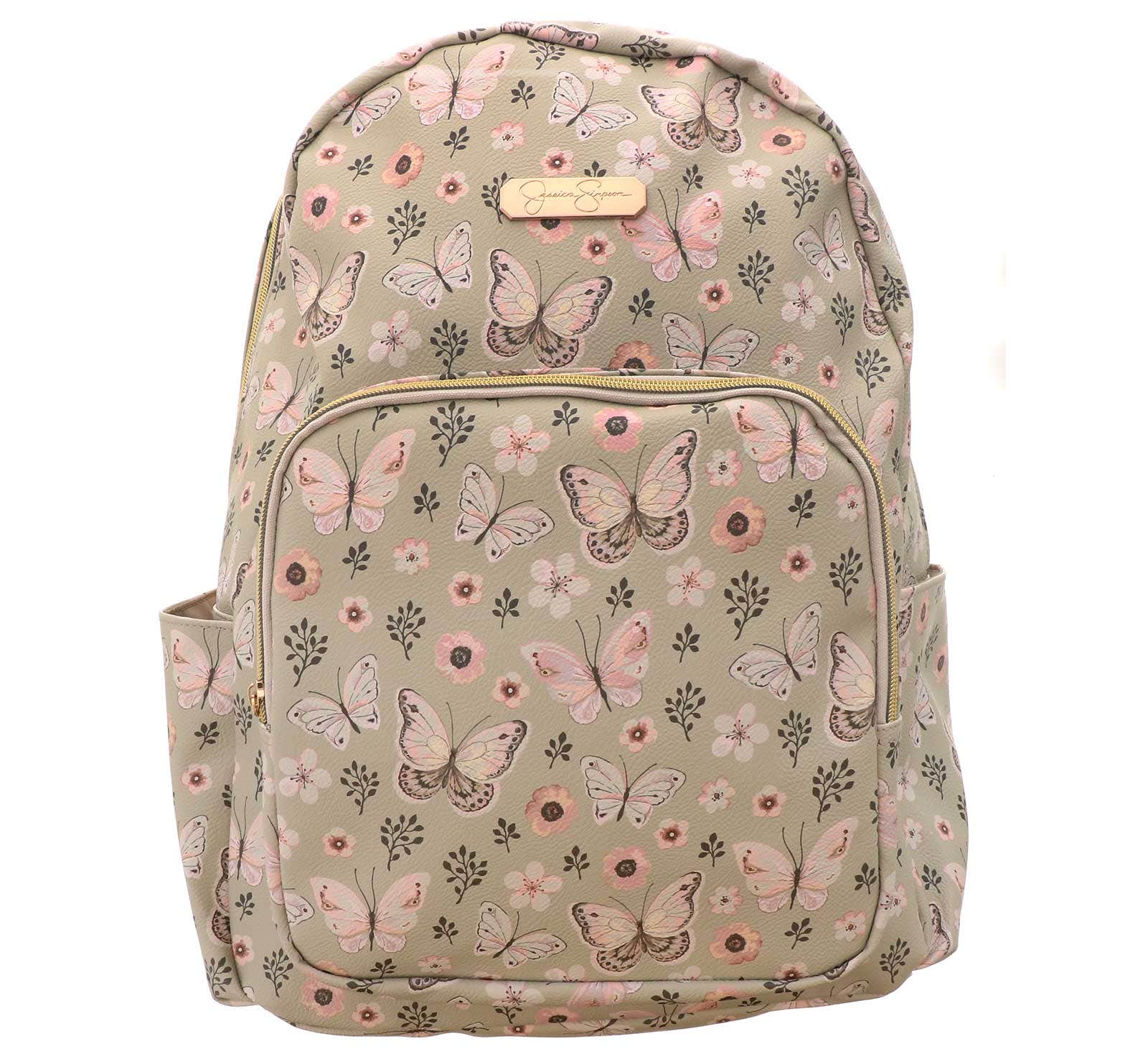 Travel to and from work or school in style with the Jessica Simpson Tan Butterfly Floral Backpack with 16in Laptop Sleeve. Padded straps help to ease stress on your shoulders, while the integrated laptop sleeve offers protection for your electronics when you’re on the move. Featuring a tan and floral design with butterflies, multiple pockets and 2 side pockets for water bottles or umbrellas.