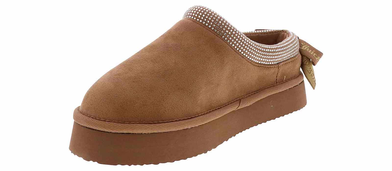 Unwind in style with the Juicy Couture Olyana Women’s Platform Clog! This plush, cozy slip on features a soft suede upper with bedazzled trim and a bow detail for an added touch of glam. The cushioned footbed with faux fur lining ensures warmth and all-day comfort, while the 1.25-inch EVA platform outsole provides long-lasting wear and traction. This Juicy Couture Olyana Women’s Platform Clog is perfect for snuggly days and relaxing nights.