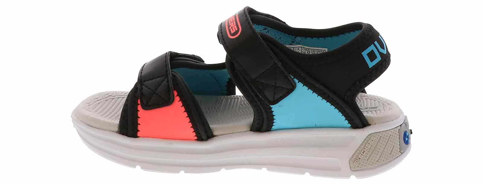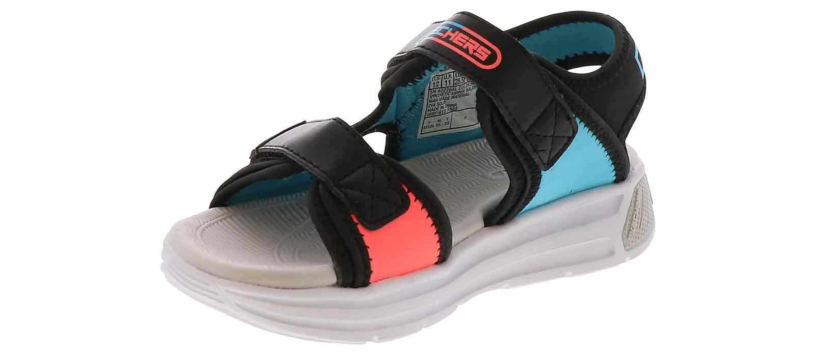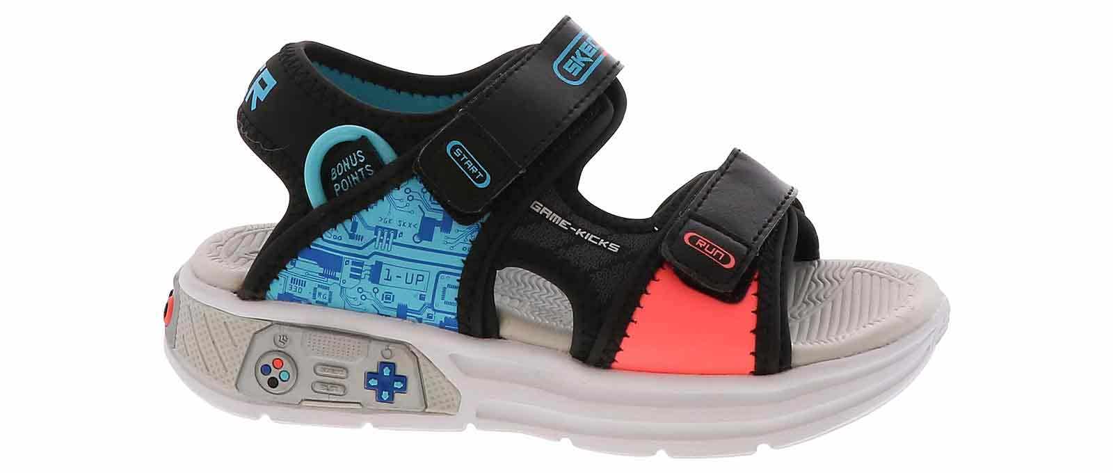 Keep his feet supported in a secure style with the Skechers Game Kicks Power Splash Youth Boys’ (11-3) Sandal! This shoe features a synthetic upper with two hook-and-loop closures and a supportive heel strap. The padded footbed adds soft cushion, while the rubber outsole gives traction and stability on all surfaces. Get your little gamer outside wearing his Skechers Game Kicks Power Splash Youth Boys’ (11-3) Sandal!