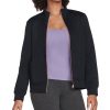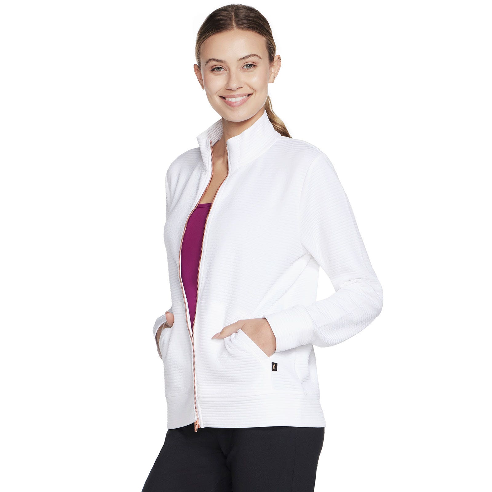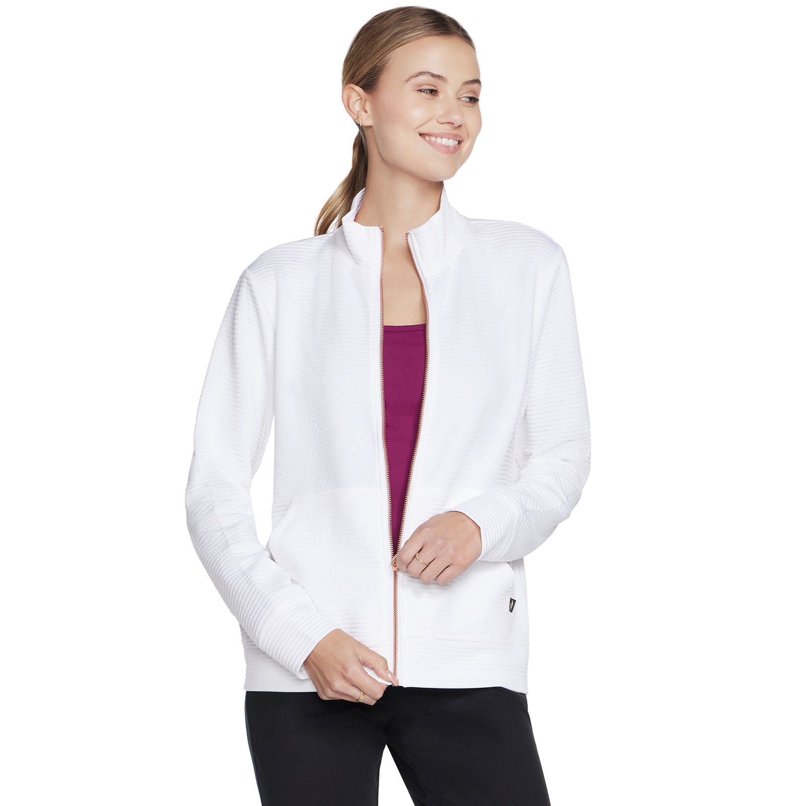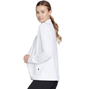 Functional style and plush soft comfort combine in everyday versatility with the Skechers Ottoman Women’s Jacket White. This knit jacket features a soft Skech-Sweats soft brushed fleece fabric, mock neck with a polished metallic zip front, long sleeves, and a split kangaroo pocket.
