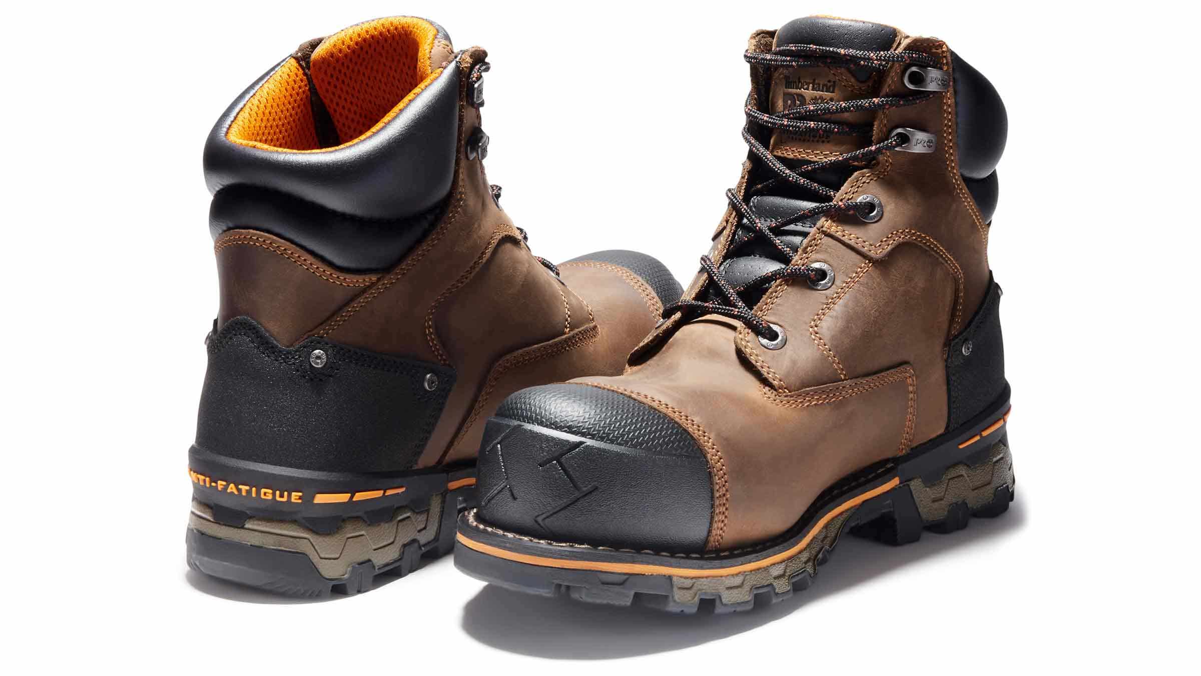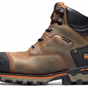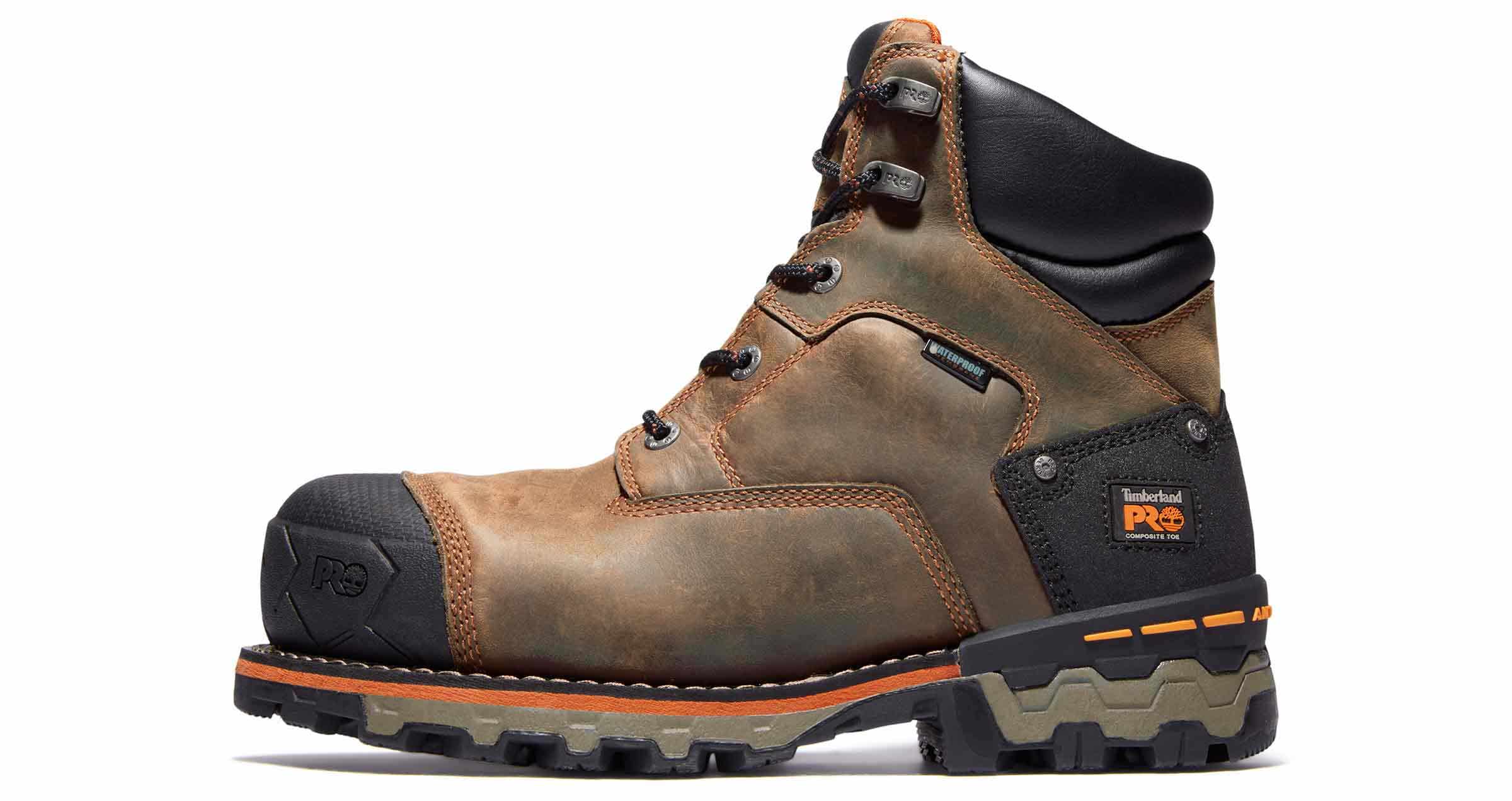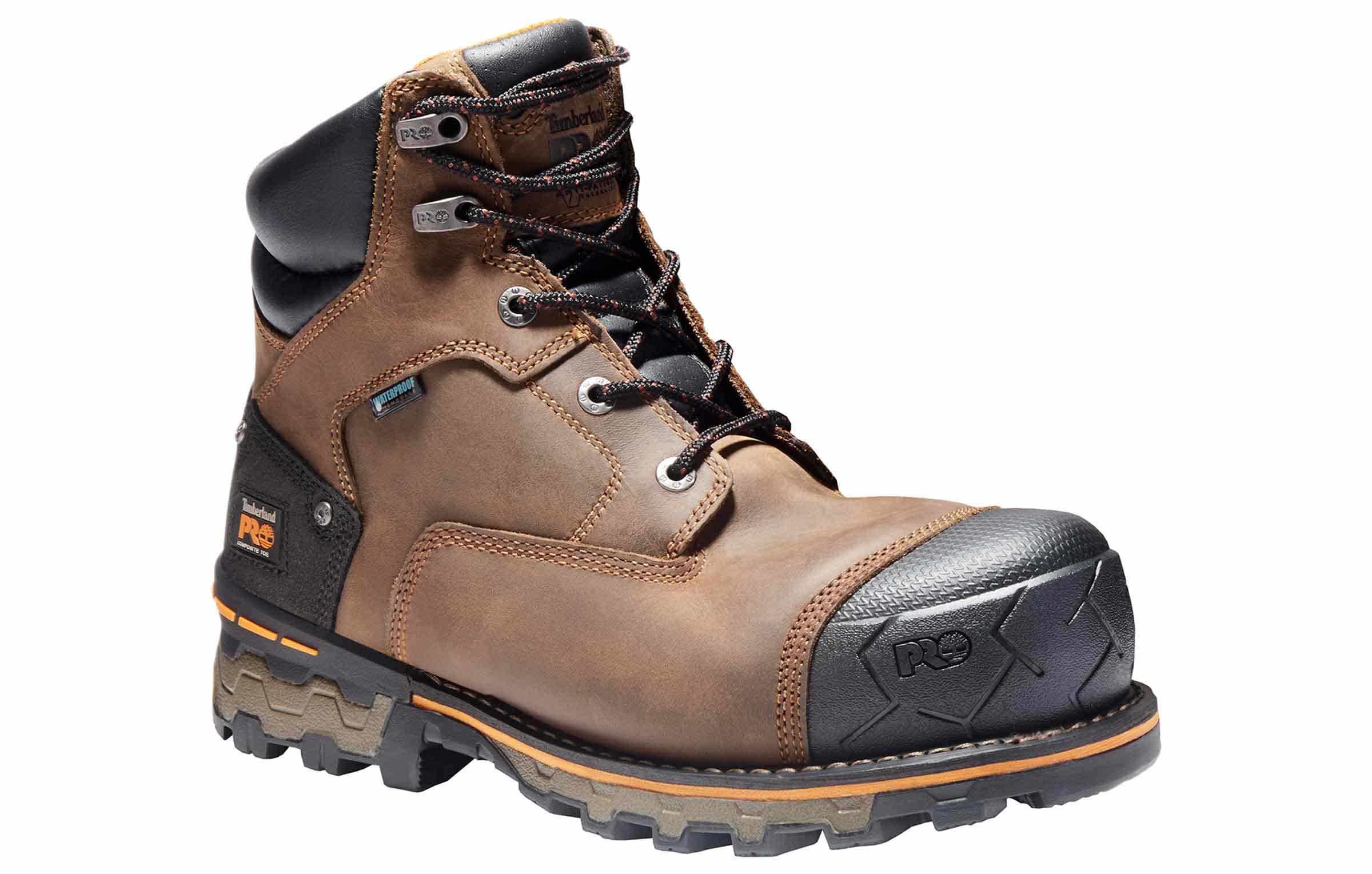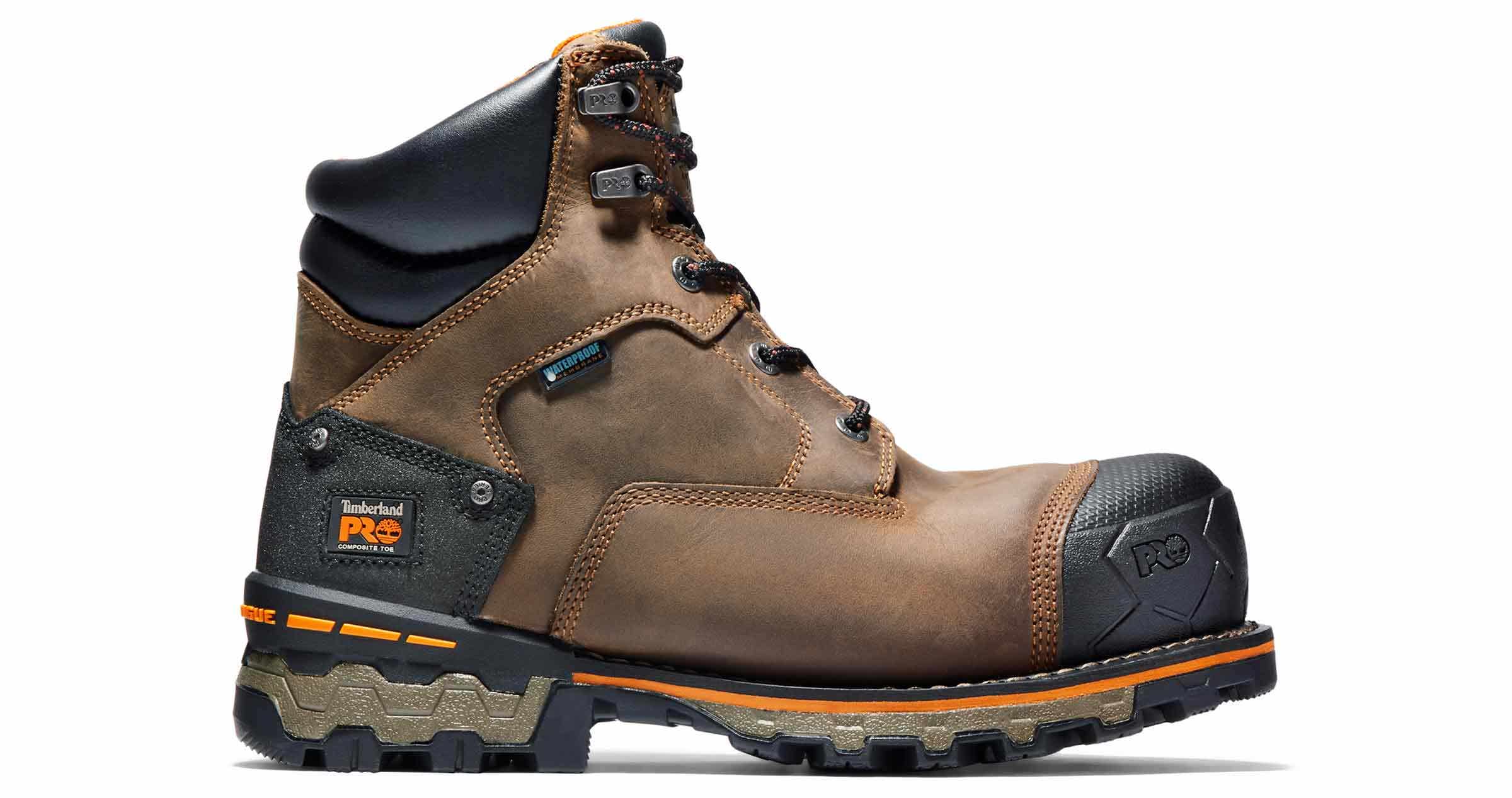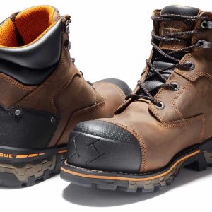 Work well in all weather conditions with these Timberland Pro Boondock Comp Toe work boots. This style features a premium waterproof leather upper and a composite safety toe to keep your toes protected. The Timberland Pro Boondock Comp Toe work boots have Electrical Hazard and blood-borne pathogen protection.