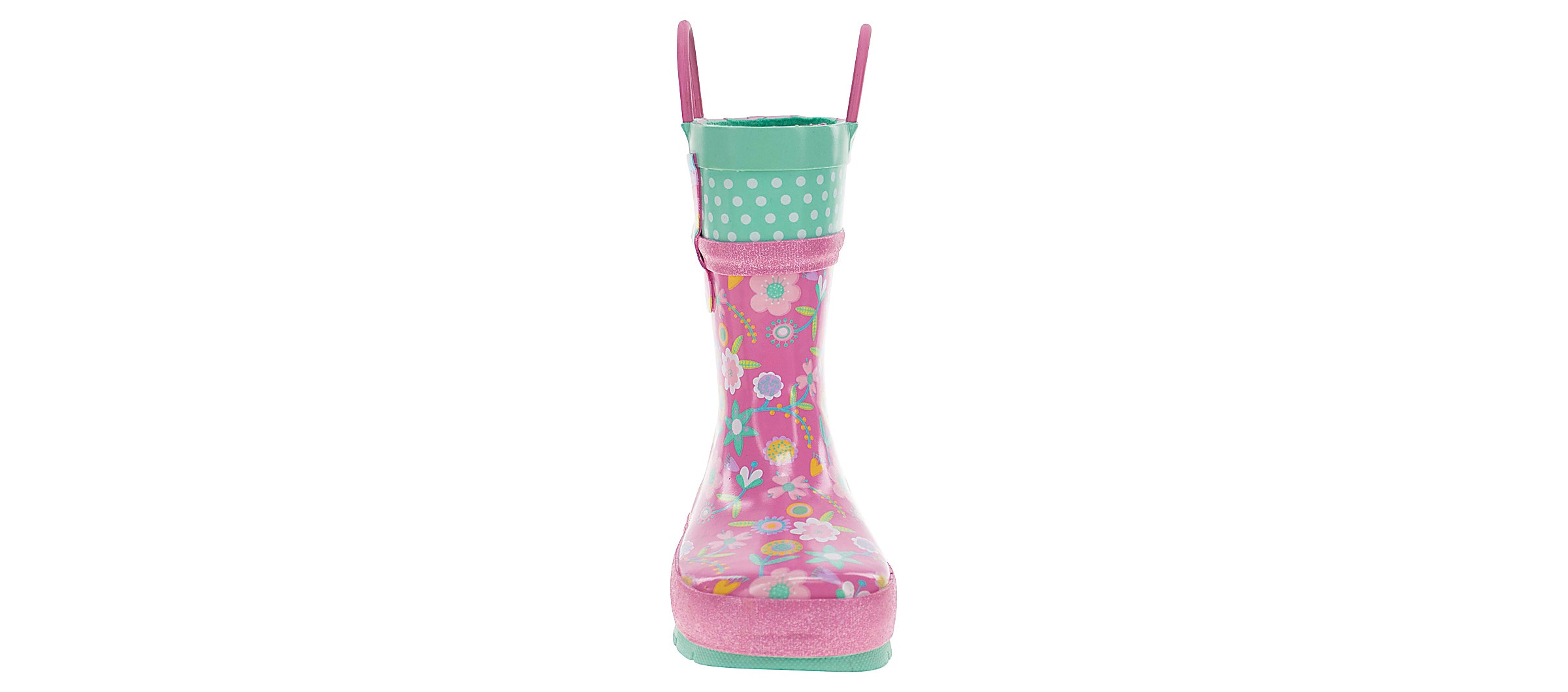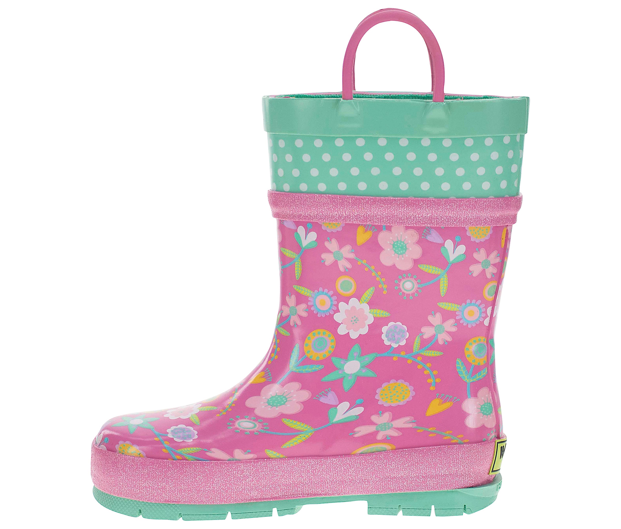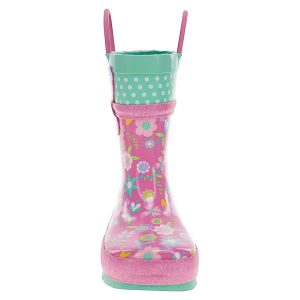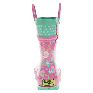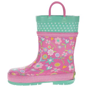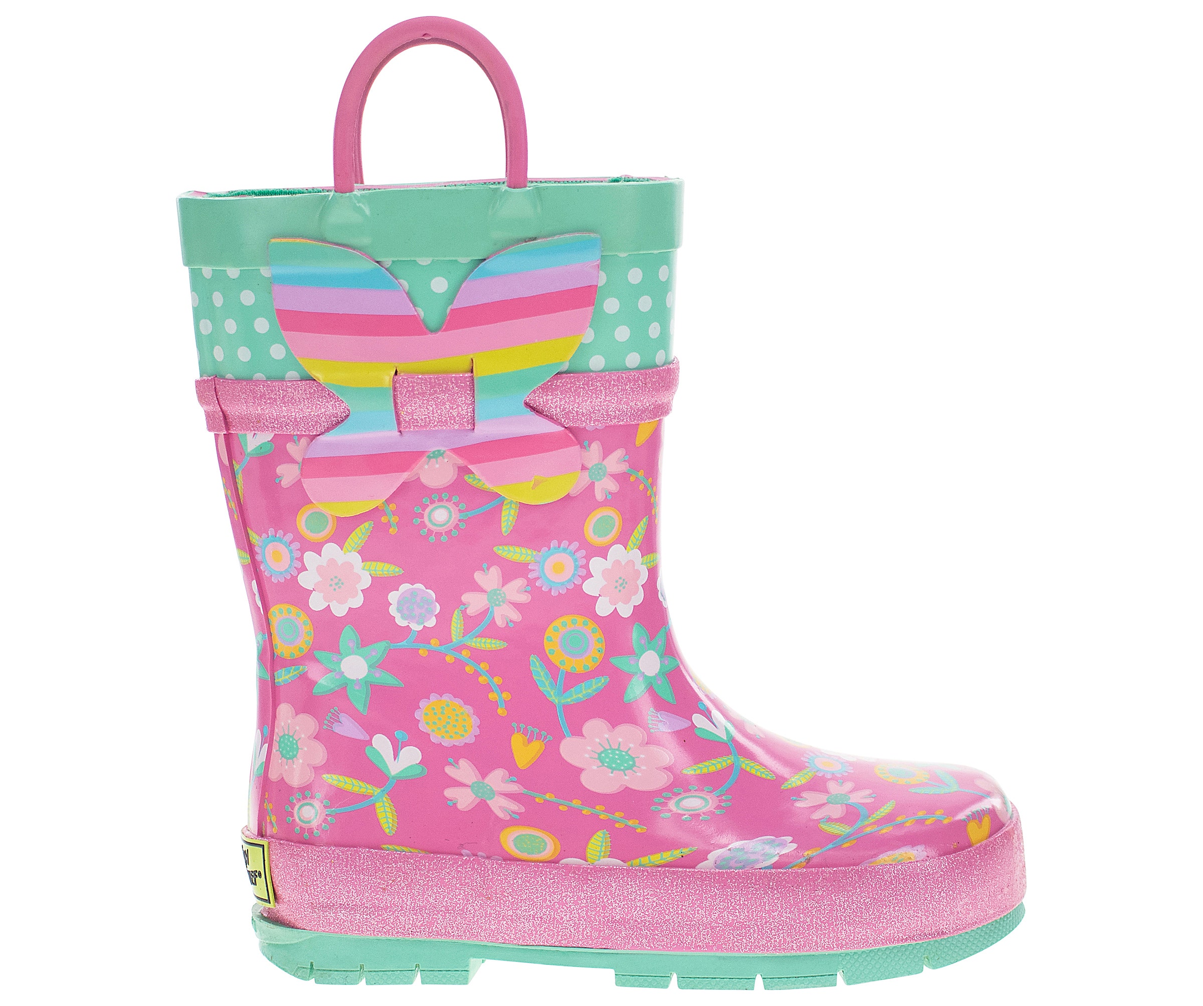 Pretty florals dance in pops of goldenrod, bubble pink, spring green, light lilac and cool sea foam mint on the Western Chief Flutter Girls’ Rain Boots. Swiss top in mint with white polka dots. Sparkle bubblegum pink glitter padded detailing. Significant lug soles in coordinating seafoam mint provides extra traction. Waterproof easy on/off with helpful dual side matching bubble gum pink pull handles to promote self-dressing. Extra padded insole for comfortable footbeds. Waterproof and easy to clean.
